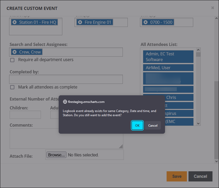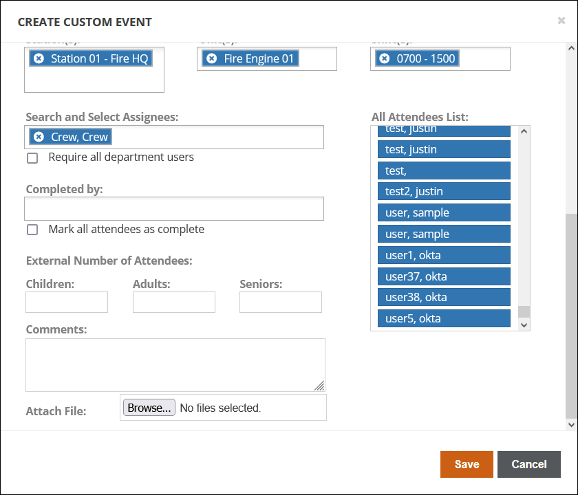 Note: When completing custom events, each person assigned to the event must be added to the 'Completed by' field before the event will be marked complete.