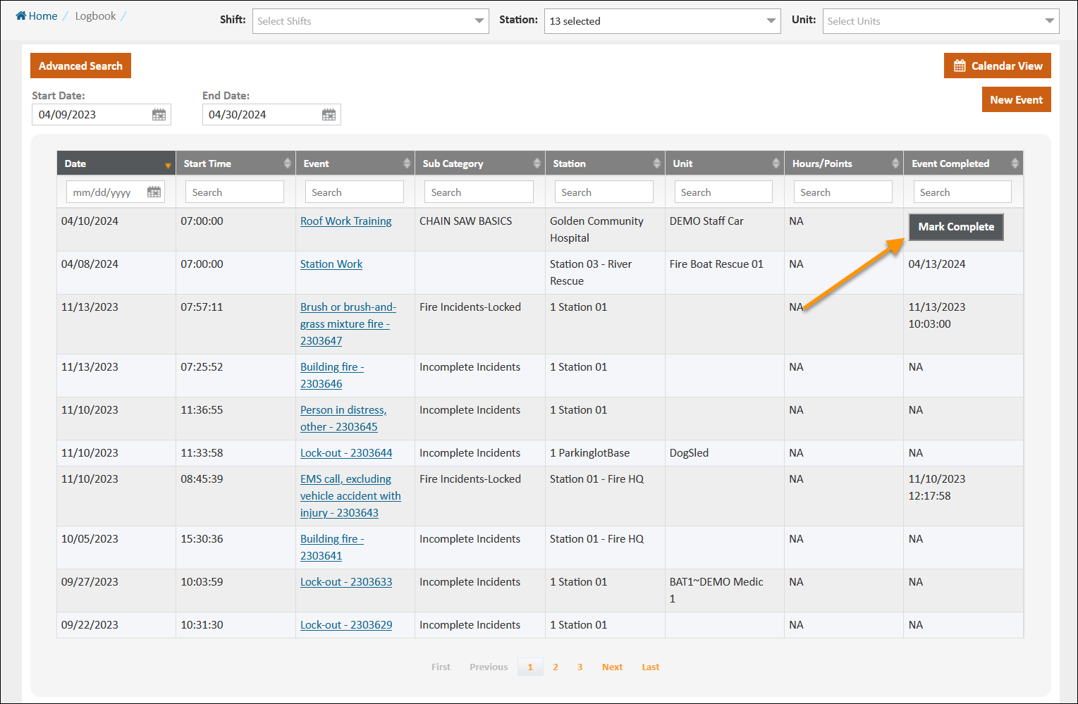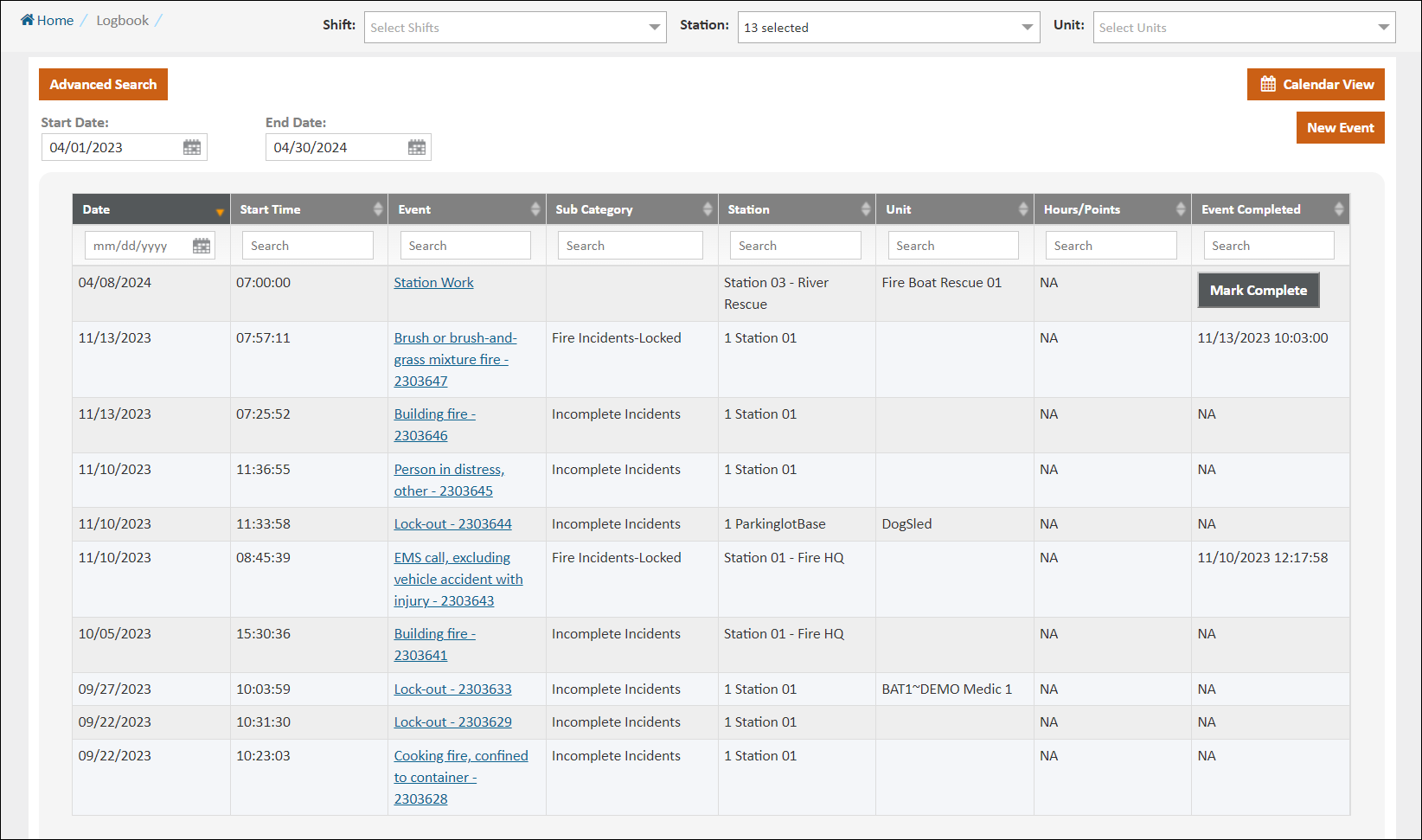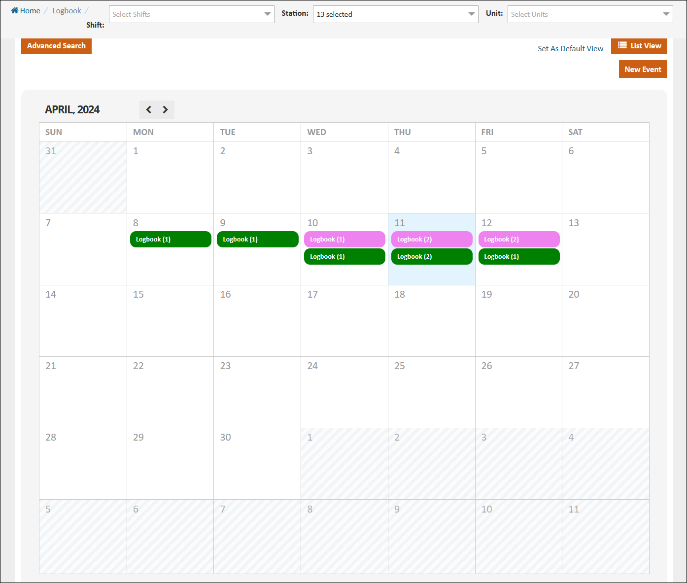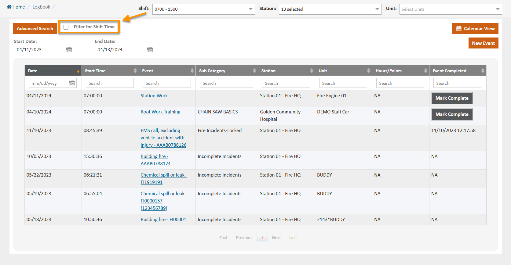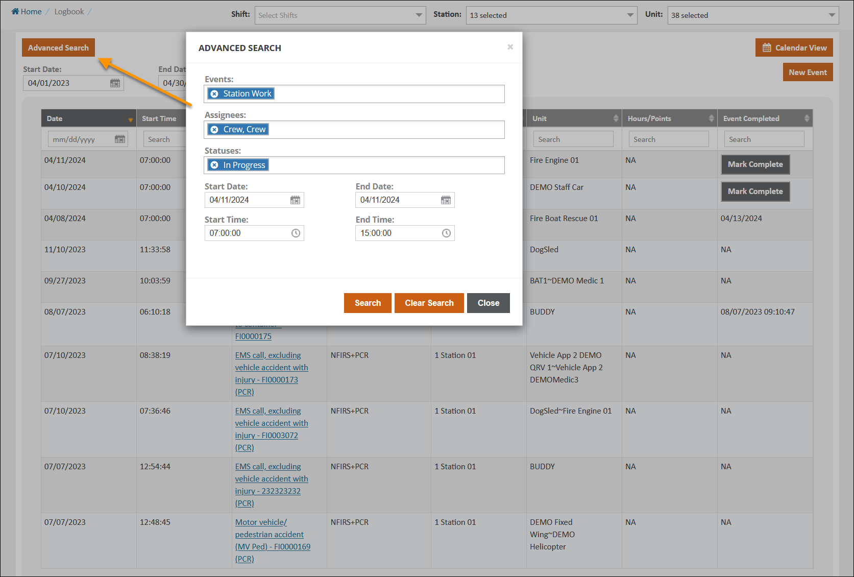 You can filter what is displayed in the Logbook by setting a Start and End Date and selecting specific Shifts, Stations, and Units. From the List View, click any column to sort by that data or use the Search bar embedded in each column to perform a search on that data. You can click Advanced Search in either view to open up more search options.