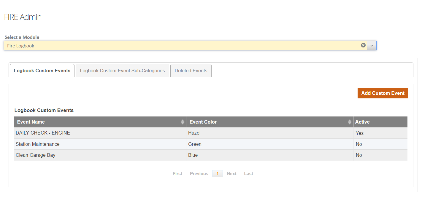 Administrators can create and edit Logbook custom event categories and sub-categories from ZOLL Fire Reports FIRE Admin. You can also restore deleted events from FIRE Admin.