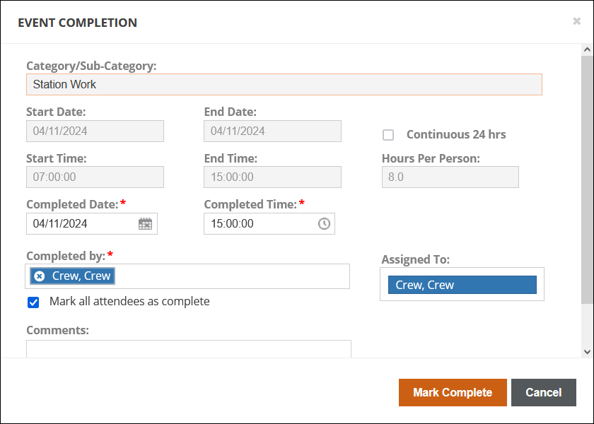 Click Mark Complete in the Event Completed column for any incomplete custom event to open the Event Completion window where you can enter a Completed Date, the personnel completing the event, and any comments. Click Mark Complete in the Event Completion window to finish completing the event.