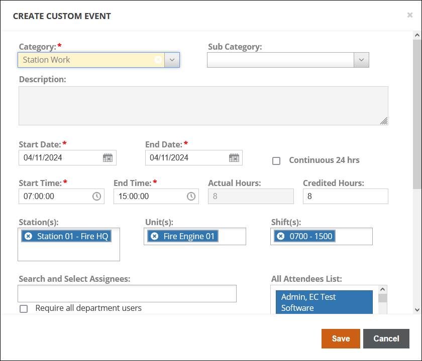 From either view, click New Event to create a new custom event. Enter the Category, Start and End Dates and Times, Assignees, and any other relevant information. The Actual Hours will be automatically calculated using the Start and End Dates and Times, but if the time to complete was different, it can be manually entered in the Credited Hours field. You can also add External Attendees and attach up to three files to an event. Click Save to finish adding the event.