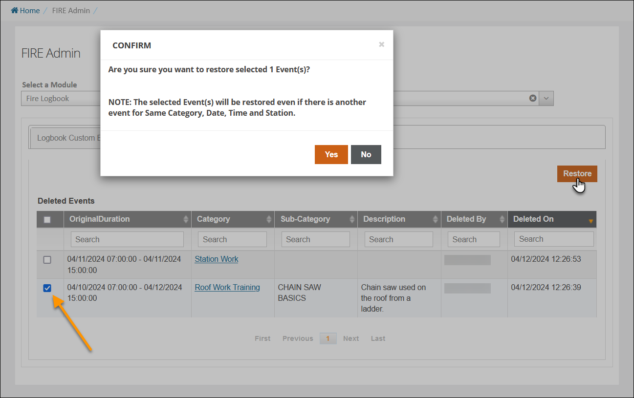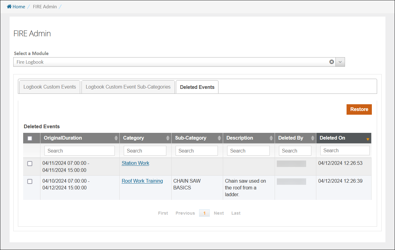 Configuration: FIRE Admin > Fire Logbook > Deleted Events