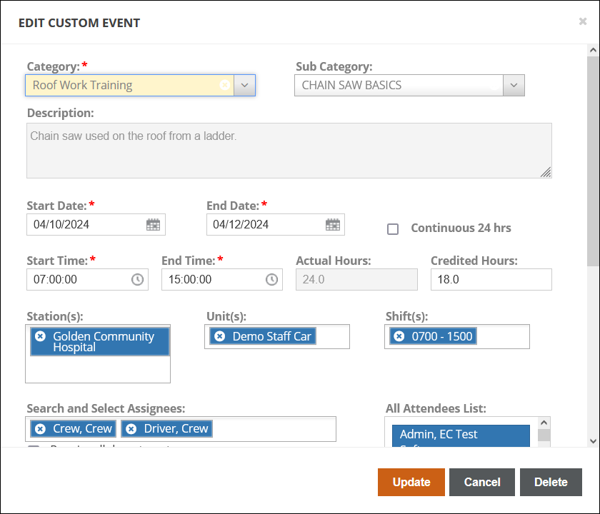Clicking on any completed custom event will open it for review. Clicking on any incomplete custom event will open it for editing. You can change any of the event information and click Update to save the changes, or click Delete to remove the event entirely.