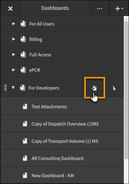 A list of collections or folders display. Hover over the collection that will hold the dashboard, and click the add dashboard icon (plus sign).   Note: If you want to start from an existing dashboard, locate the name in the collection and click Clone, then click Edit to make changes. By default the clone is put into the same collection.