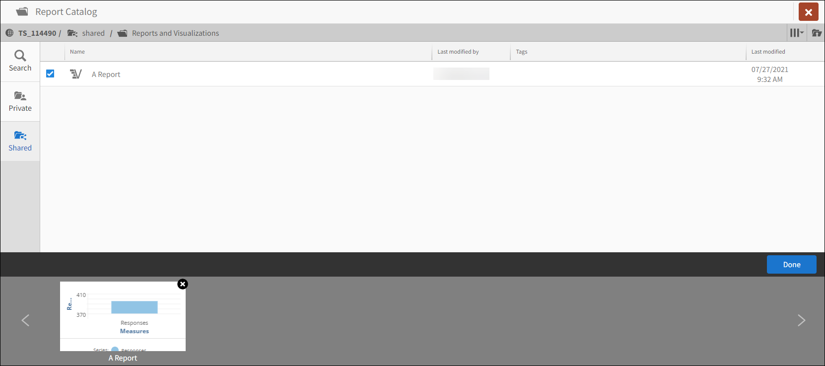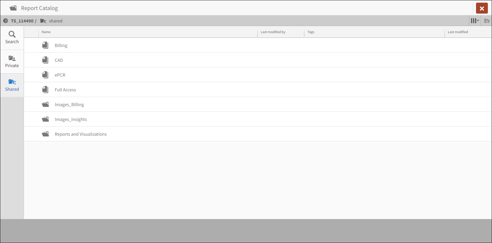 The Report Catalog contains both private and public folders that store your reports. To find a report, open the folders and scroll down the list of reports, or use Search to find reports by name.