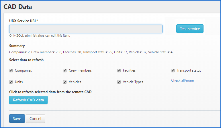 The ‘UDX Service URL’ setting in the CAD Data window is used to establish an interface to the CAD. ZOLL will configure this setting for you.