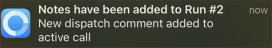 When Respond is running in the foreground and Dispatch or another field user has added notes to an active call, field users will receive a notification on the top of the screen informing them that notes have been added. The notification will remain on the screen until the user swipes the notification to dismiss it. While the notification includes a preview of the added note, the user can navigate to the trip information tab at any time to view the note under the Notes section.