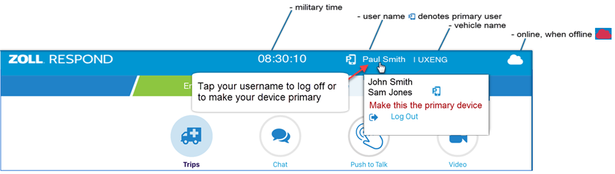 Use the top bar of your Respond screen to see current military time, your username, and vehicle name.